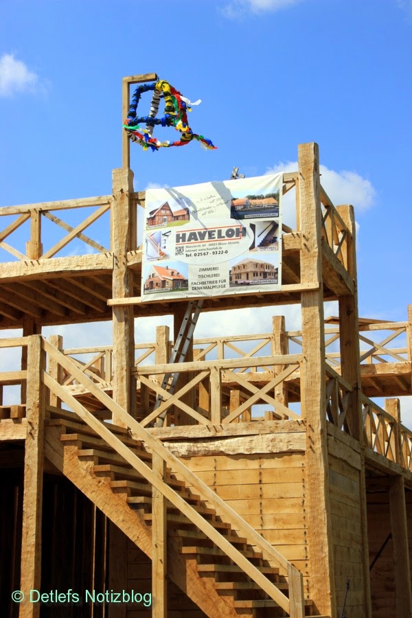 Nach den traditionellen Gepflogenheiten der Zimmerleute und beteiligten Handwerker wurde Richtfest gefeiert: Nach dem Richtspruch der Zimmerleute nahmen LWL-Kulturdezernentin Dr. Barbara Rüchoff-Thale und LWL-Baudezernentin Judith Fischer den Zimmermannshammer in beide Hände und schlugen die letzten Nägel ein. „An historischer Stelle sollen Schritt für Schritt weitere Gebäude, die archäologisch ausgegraben und wissenschaftlich untersucht werden, originalgetreu neu entstehen“, schilderte Dr. Barbara Rüchoff-Thale.